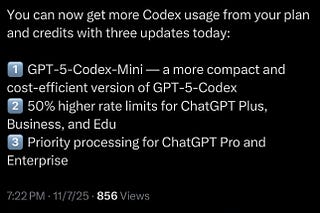 ① OpenAI 发布 GPT-5-Codex-Mini。这是一个成本效益高、性能接近 Codex High 且速率限制高出 50% 的新模型。消息来源