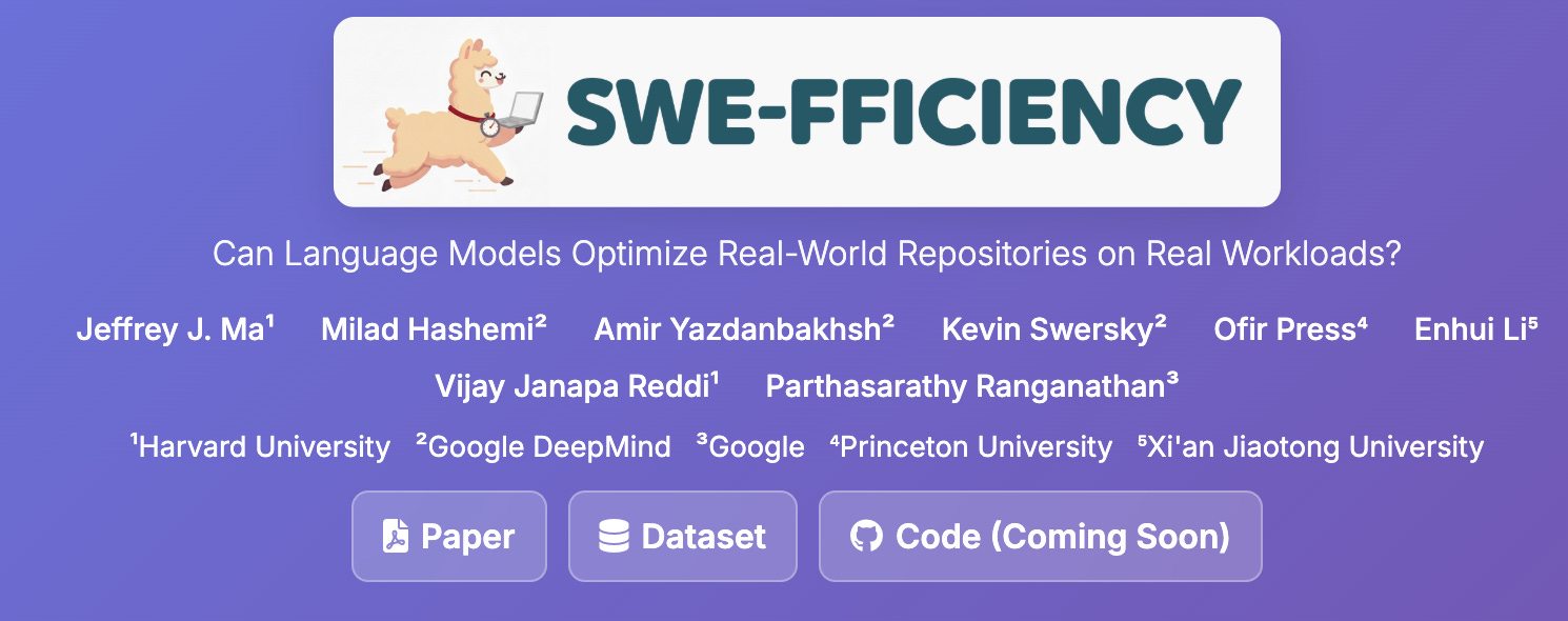 ⑤ SWE-fficiency 挑战语言模型在真实工作负载下优化 Python 代码库的运行时,包含 498 个任务。评估结果显示,当前最先进的模型性能显著不足,平均仅达到专家加速的 0.15 倍,在定位优化机会、跨函数推理和保持正确性方面存在困难。官网地址