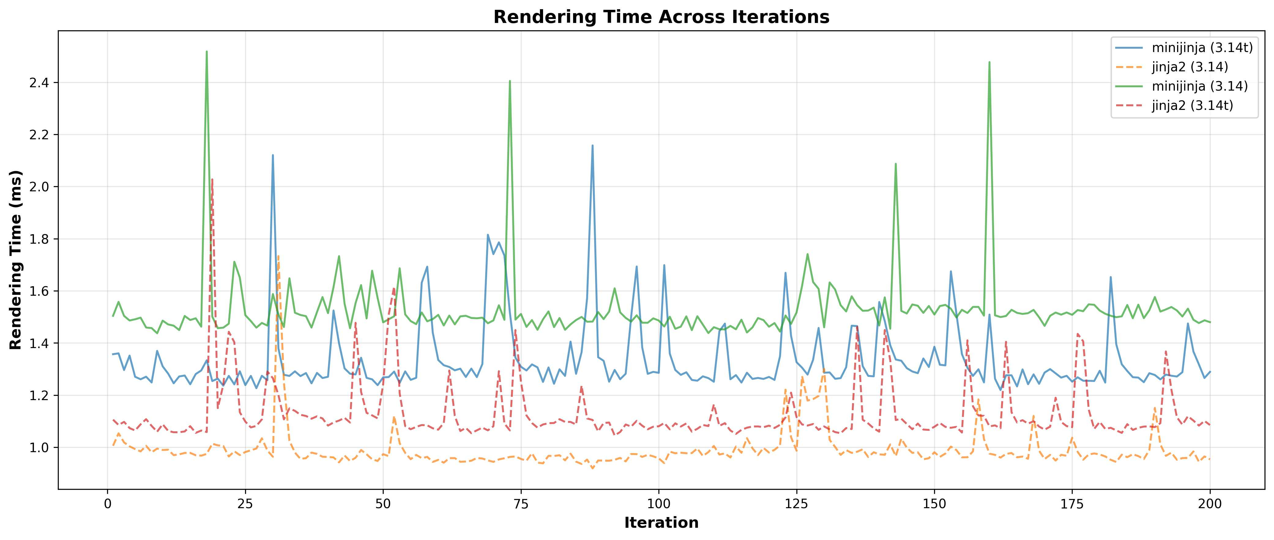 Claude Code 自动生成的 MiniJinja 与 Jinja2 性能对比图表,对比了 Python 3.14 和 3.14t 版本下的渲染性能